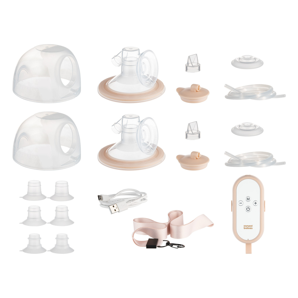 Sada obsahuje: napájací kábel typu C, ovládacie zariadenie odsávačky mlieka (telo odsávačky), silikónová membrána 2 ks, spätný ventil 2 ks, lievik o veľkosti 27 mm 2 ks, zásobník na zber mlieka 2 ks, uzáver membrány 2 ks, silikónová hadička 2 x 19mm, 2 x 21mm, 2x 24mm), šnúrka na zavesenie odsávačky, nadstavec na ramienko podprsenky 2 ks.