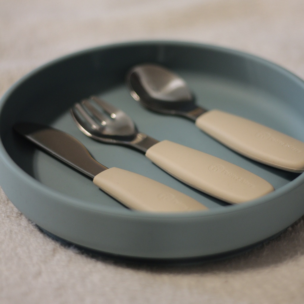 Funkčné časti sú vyrobené z kvalitnej nehrdzavejúcej ocele, rukoväte sú ergonomické a potiahnuté mäkkým silikónom vhodným na kontakt s potravinami – ideálne prispôsobené detským rúčkam. To zaručuje pohodlný a istý úchop a podporuje správne stravovacie návyky.