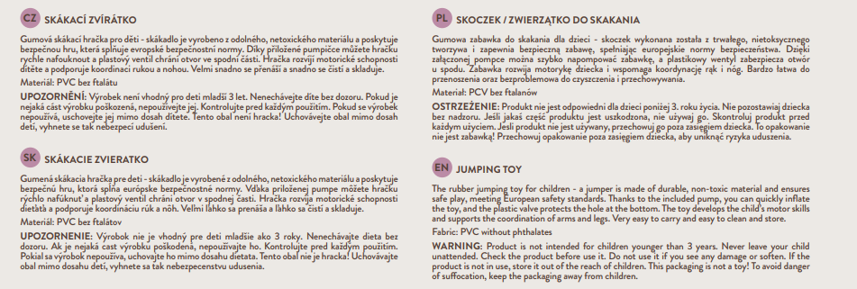 Skákadlo je bezpečné pre deti, neobsahuje škodlivé látky. Vďaka svojmu dizajnu je odolný proti prepichnutiu a zodpovedajúce profilovanie poskytuje stabilné a bezpečné miesto na sedenie.